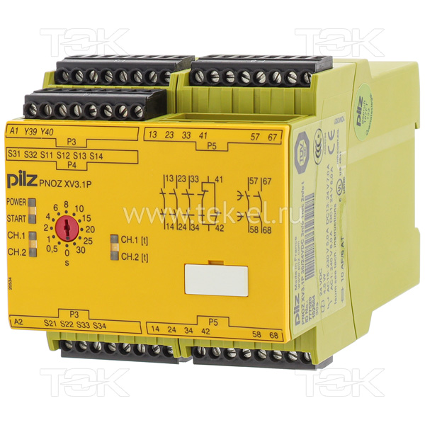 PNOZ XV3.1P 30/24VDC 3n/o 1n/c 2n/o t Реле безопасности 2-х канальное: Uпит. 24V DC, выходы 3НО + 2НО с задержкой срабатывания 0.1…30сек., доп. выход 1НЗ, съёмные винтовые клеммы, IP40