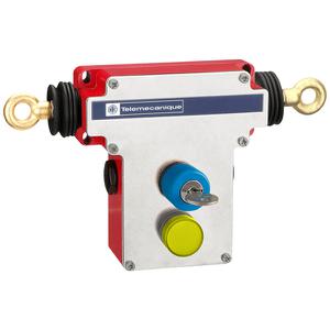 XY2CEDA597 Барьер (выключатель) безопасности тросовый: до 100м, крепление справа и слева, контакты 2НО+2НЗ замедленного действия, сброс кнопкой с ключом, LED индикация 230…240V AC жёлтый, сильфон нитрил, ввод 3 х PG13.5/М20, IP65