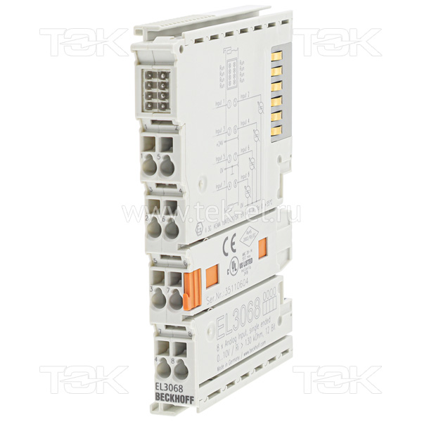 Модуль аналоговых входов EL3068 обрабатывает сигналы в диапазоне от 0 до 10 В. Напряжение оцифровывается с разрешением 12 бит и передается (с гальванической развязкой) на вышестоящее устройство автоматизации. Модуль EL3068 EtherCAT объединяет восемь каналов в одном корпусе. Контакты питания подключены через клеммы. Контакт питания 0 В используется в качестве опорного заземления для входов. Состояние сигнала терминала EtherCAT отображается светодиодами.