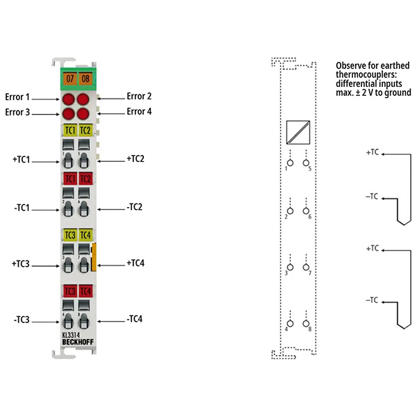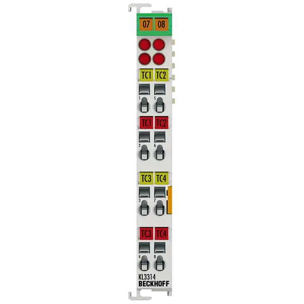 Модуль аналоговых входов KL3314 позволяет напрямую подключать четыре термопары. Схема модуля полевой шины обеспечивает работу датчиков термопар по двухпроводной технологии. Линеаризация во всём диапазоне температур, который может быть выбран произвольно, выполняется с помощью микропроцессора. Светодиоды индикации ошибок сигнализируют об обрыве провода. Компенсация холодного спая осуществляется за счёт внутреннего измерения температуры на клеммах. Модуль KL3314 также может использоваться для измерения напряжения в милливольтах.