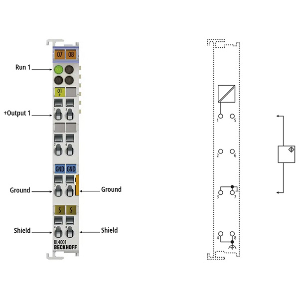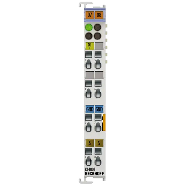 Модуль аналоговых выходов KL4001 генерирует сигналы в диапазоне от 0 до 10 В. Напряжение подается на уровень процесса с разрешением 12 бит и имеет электрическую изоляцию. Выходные каналы модуля имеют общий потенциал земли. Модуль KL4001 особенно подходит для сигналов с электрически изолированными потенциалами земли. Светодиоды работы индицируют обмен данными с модулем сопряжения шины.