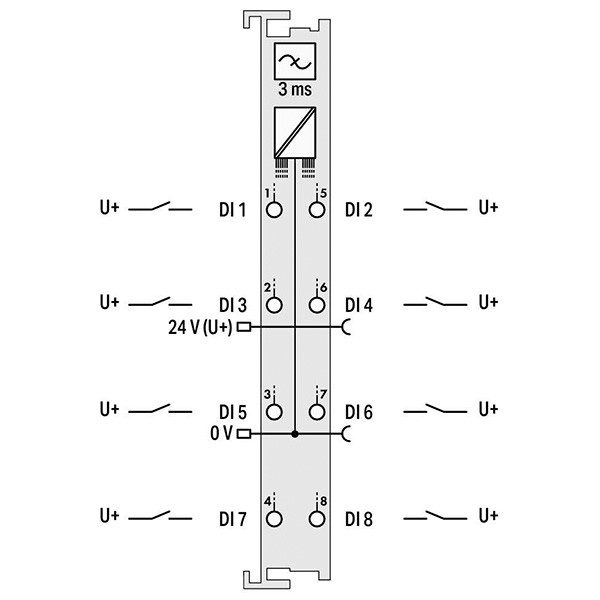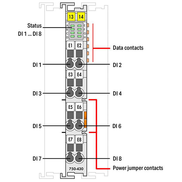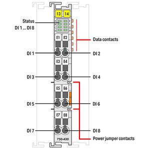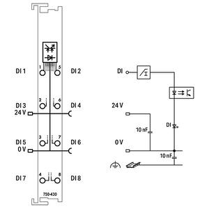Модуль дискретных входов 750-430 имеет восемь каналов шириной всего 12 мм (0,47 дюйма). Он принимает управляющие сигналы от цифровых полевых устройств (например, датчиков). Каждый вход оснащён фильтром подавления помех. Полевые и системные уровни электрически изолированы.