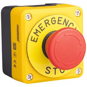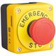 P1EC300E40K Пост кнопочный, 1-местный, кнопка аварийная Ø40мм 1НО красная с табличкой "EMERGENCY STOP", корпус жёлто-чёрный пластик, IP65