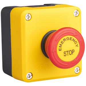 P1EC400E40E Пост кнопочный, 1-местный, кнопка аварийная Ø40мм 1НЗ красная с надписью "EMERGENCY STOP", корпус жёлто-чёрный пластик, IP65